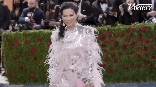 ▲ 这位美籍韩裔女演员因为《艾米丽在巴黎》走红,被称为“北美贾玲”。她身穿一袭亮粉色紧身胸衣和黑色鸵鸟毛长裙,搭配绿色细带高跟凉鞋,首次亮相Met Gala。只不过裙子的颜色实在太挑人了……红毯上的生图基本没几张能看的。