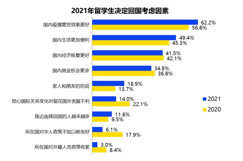 2021年留学生决定回国的考虑因素中,国外形势并不是主要原因。