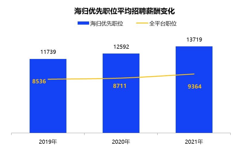 报告显示,截止到2021年,海归薪酬连续3年上涨,而且增速有上升的趋势。海归优先职位的平均薪资突破13k,超出全平台职位46.5%。