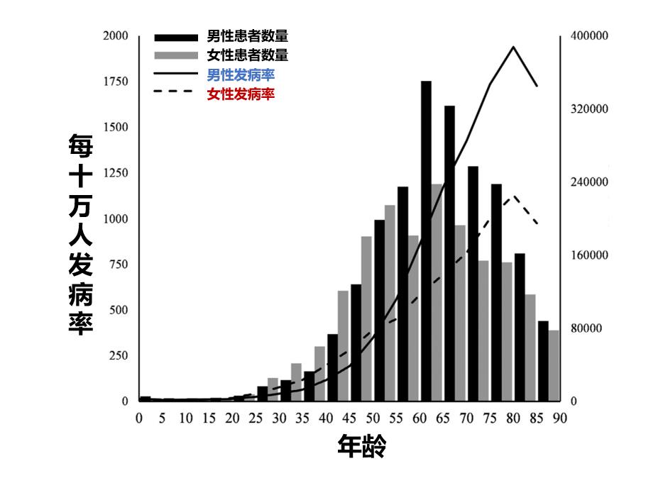 中国的癌症越来越多,最重要的原因就是老人越来越多。从下图可以看出,中国人随着年龄的增加,无论男女,癌症发病率都是逐渐上升的。尤其是45岁以后,癌症的发病率开始显著上升。