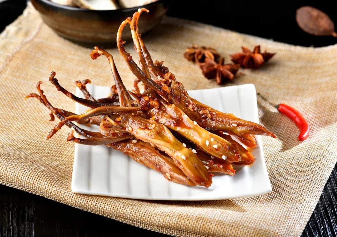 酱鸭舌是温州零食里最响亮的一张名片。小小的一根鸭舌,在温州人的手上,竟然就卖到了1公斤160元。因为“舌”谐音“折”,折本(亏本)可是做生意的大忌,太不吉利,因此温州人把鸭舌叫做鸭赚。得了个好名字的鸭舌也不负温州人重托。