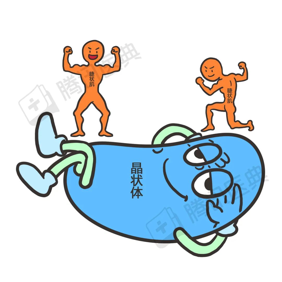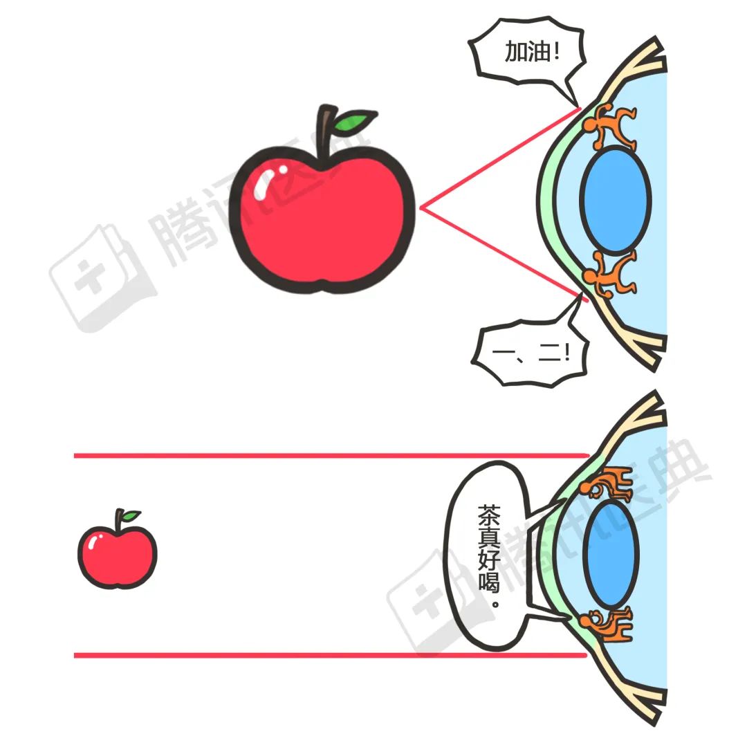 为了看清楚不同距离的东西,和晶状体手拉手的睫状肌就要使出不同的力气,改变这个变焦镜头的形状,使得光线聚焦得不差分毫[2]。看远处的苹果时,睫状肌放松,晶状体更扁平
