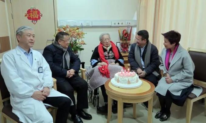 2021年1月,众人就按照庆祝虚岁的传统为秦怡送上了百岁生日蛋糕。(上海电影集团供图)