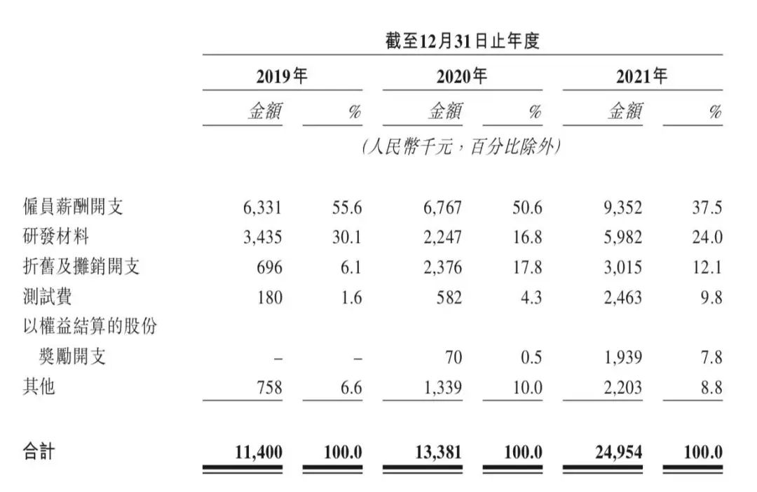 巨子生物研发成本构成 来源 / 招股书最新递交招股书的巨子生物,2019-2021年,研发费用分别为1140万、1338万和2495万,仅占营收的1.2%、1.1%和1.6%。2017-2020年,创尔生物每年的研发费用基本维持在年营收的5%-6%,到2021年,才增至9%。