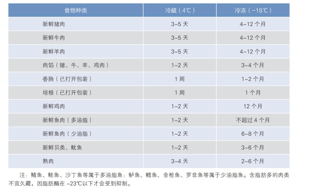 冷冻条件下大多数微生物处于休眠状态,因此食品冷冻能保存 / 保鲜较长时间。考虑到有些微生物在低温环境下也可以存活繁殖,建议冷冻食品在家储存时,应关注生产日期、保质期,保证食品在保质期内尽快食用;冷冻散装食物时可分成若干小包装,每次食用一份,避免反复冻融,增加食品安全风险。冰箱储存肉类的适宜时间见下表,冰箱储存食物过程中的注意事项见下图。