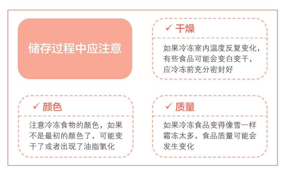 冰箱储存食物过程中的注意事项在超市 / 市场选购冷冻冰鲜食品时,可佩戴一次性塑料袋套挑选,避免用手直接接触;如果网购境外冷冻食品,也要关注海关食品检疫信息,给外包装消毒后食用或保存。