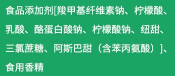 除了白砂糖、食用香精之外,还添加了7种食品添加剂。其中的三氯蔗糖是一种甜味剂,甜味是蔗糖的600倍。想一想,长时间给宝宝饮用这样的牛奶的后果是什么?势必会影响宝宝对自然食物的接受度,增加挑食、厌食的风险。