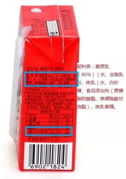 (炼乳制作过程中会添加较高的蔗糖,含量高达40%,在食用之前都要加水进行稀释。)从配料表中可以看到,不仅复原乳本身添加了炼乳,还添加了白砂糖,糖含量可想而知了。