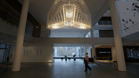 MoMA的新大厅里,有个由屏幕、主机,金属通风口,灯具,巨大的倒三角形灯阵组成多媒体艺术装置《Echo》,第一次走进大楼,你可能会被它的动静吓一跳。