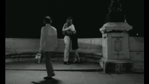 亚历克斯走出房间,带上收音机,来到河岸边,看到拥吻的恋人,那是爱情美好的模样,然而旋转的起舞和形式感都提示着这不过是一场对于布列松“模特论”的践行,不过是关于理想爱情的虚幻表演,与艾历克斯并没有什么实质的关系。