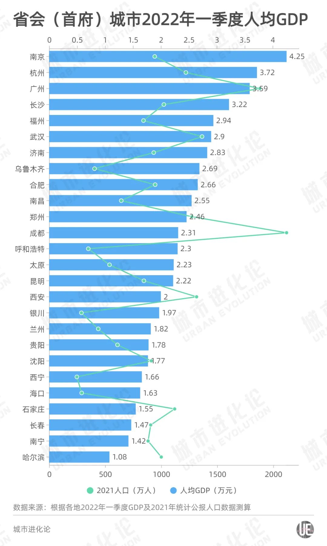 从今年一季度最新数据看,26个省会城市中,4城人均GDP超三万元,分别是南京、杭州、广州和长沙,这其中南京一季度人均GDP超过4万元,达到4.25万元;其余22个省会城市一季度人均GDP均在1~3万元之间。