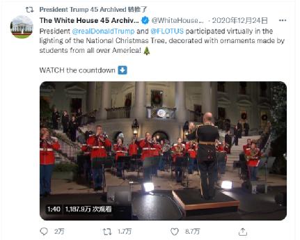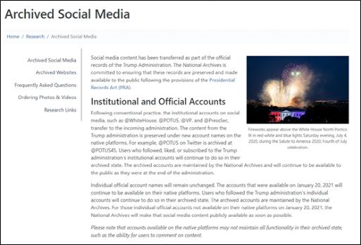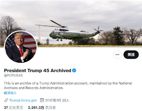 首先,这个账号的认证符号下明确表示,该账号是由美国国家档案馆控制和操作,和特朗普被封禁的个人账号“@realDonaldTrump”不同,该账号的域名为“POTUS45”,意即“美利坚合众国第45任总统”。据美国国家档案馆官网介绍,这个账号是按照《美国总统存档法案》的要求,将历任美国总统在社交网络上发布的内容进行存档的常规操作。