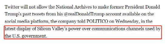 而对于特朗普许多原创内容在存档账号不可见这点,美国舆论界此前也有过一番争论。4月7日,美国著名时政媒体“政客”新闻网刊发了一篇专题报道,提到了推特公司对美国国家档案馆的回复,在回复中,推特明确表示特朗普被封账号的原创内容,将不会在美国官方搭建的存档账号里被重新开放浏览。
