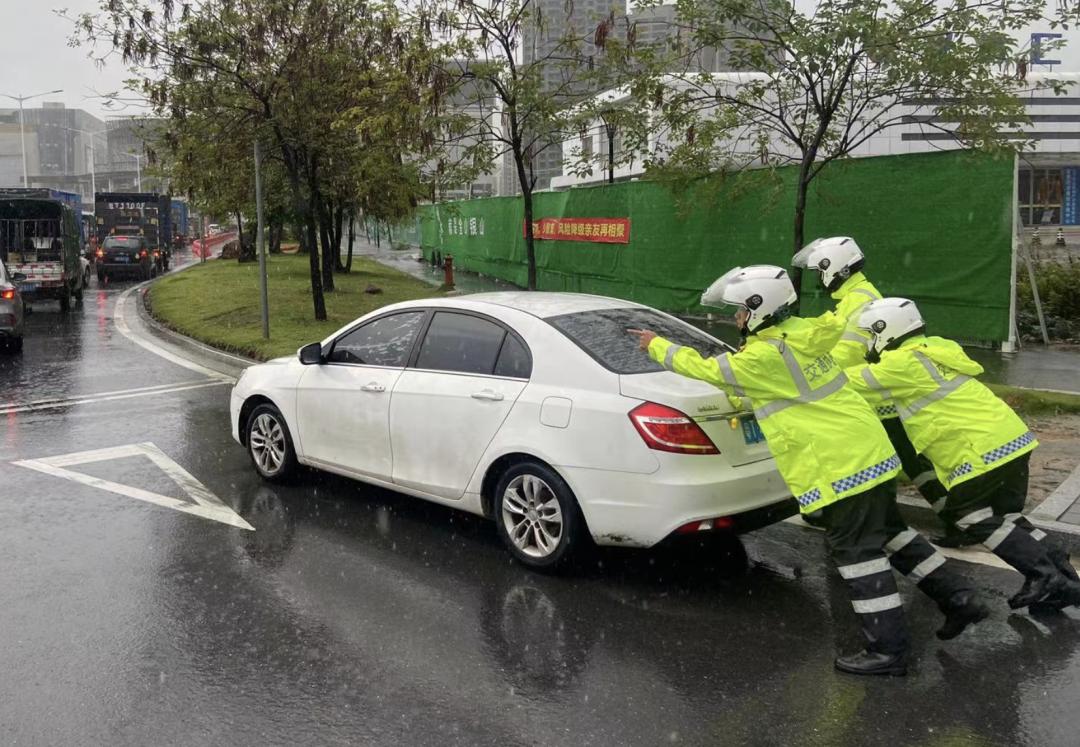 5月11日下午16时30分许,江海交警大队铁骑在外海大桥堵塞路段发现一辆故障车辆,为保证道路畅通,铁骑帮助车主将车辆推至路边安全地带,车主对铁骑连声表示感谢。