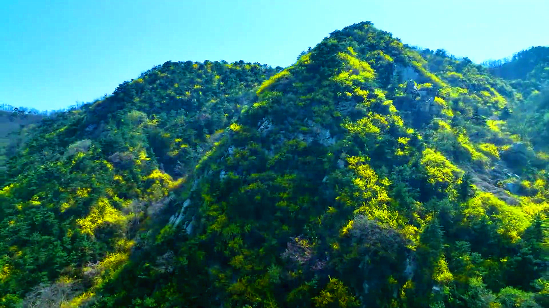 在南山区山野春深处,连翘遍野,绚烂满山,一幅“满山尽带黄金甲”的景象。
