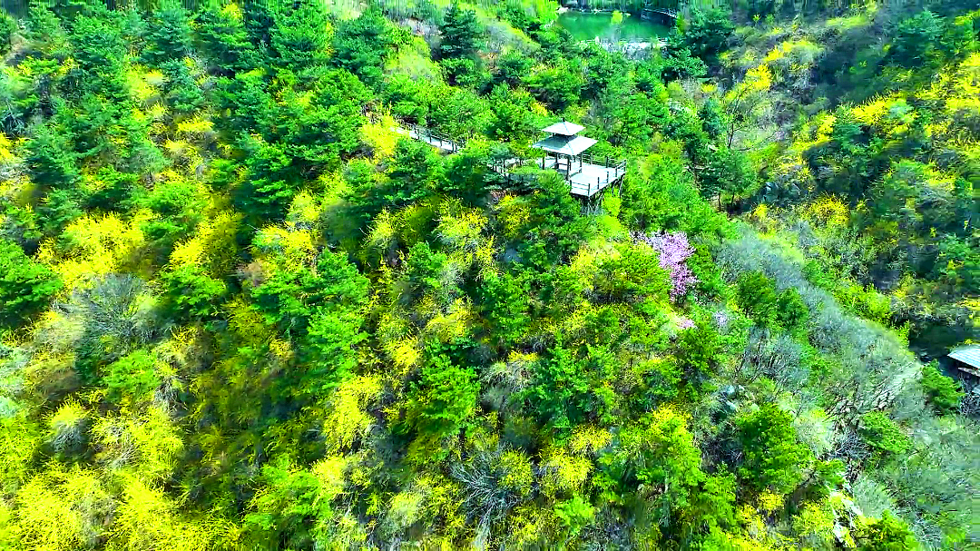 九如山景区繁花似锦,芳菲尽染,“颜值”爆表。漫山遍野的黄色在山间燃烧,迸发短暂生命中的所有光彩,木屋于青翠山野间 焕发生机与浪漫,阳光折射的闪闪星光在湖面铺满。