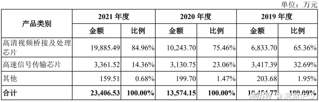 从收入结构来看,公司高清视频桥接及处理芯片产品营收占比逐年升高,从2019年的65.36%增长至2021年的84.96%,是公司主要营收来源,高速信号传输芯片产品营收占比则从2019年的32.69%降至2021年的14.36%,比例不断下降。