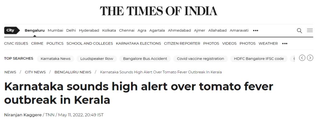 《印度时报》称,在印度喀拉拉邦暴发“番茄流感”后,卡纳塔克邦与喀拉拉邦接壤的地区也发出高度预警。印度报业托拉斯(PTI)说,这种罕见疾病的传播也让泰米尔纳德邦政府感到担忧,一个医疗小组正在泰米尔纳德邦-喀拉拉邦交界地区,对进入泰米尔纳德邦哥印拜陀的人进行发烧、皮疹和其他疾病的检测。
