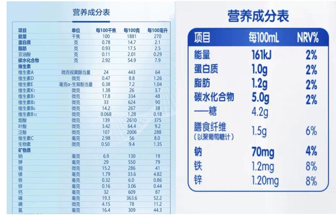 营养标签是食品标签的重要组成,一般都会标注能量、蛋白质、脂肪、碳水化合物以及各类维生素和矿物质的含量,还会标注营养素参考值(NRV),是以成人的营养素推荐摄入量为判断依据,比较该食物每份提供的营养素占一日需要量的百分比。配方奶标注的营养素种类比较全,而很多市售食物仅会标注几种重要的营养素,如能量、蛋白质、脂肪、碳水化合物、钠等。前文展示的配方奶和乳饮料的差别就可以从营养标签中非常清晰地比较出来。