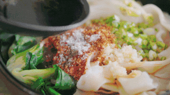 拌好的油泼面,水晶晶,油汪汪,入口香辣入味,面皮筋道,一碗油泼面把面食应有的香气发挥到了极致!好想在油汪汪的油泼面上滑滑梯哦!
