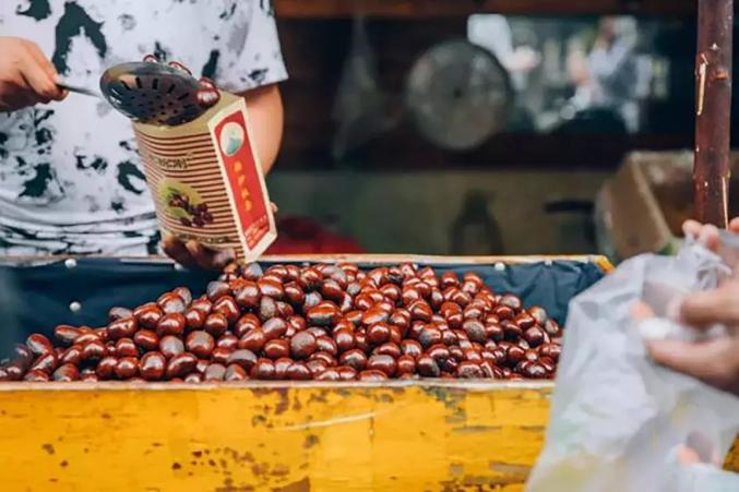 /糖炒栗子/每次看到糖炒栗子的身影,才会意识到秋冬来了呀。秋天,西安有些知名的栗子老店,门口早早排起了长龙。剥一个个香甜的栗子,走在长安的街头吧。