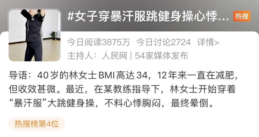 随着夏天临近,越来越多的人开始注重身材管理。除了身体力行做运动外,装备自然也必不可少。最近,#女子穿暴汗服跳健身操心悸晕倒# 在微博上引起热议。