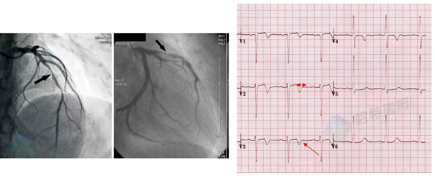 图4 前降支近段病变vs T波倒置正常情况下,心室复极从心外膜向心内膜进行,当心外膜下心肌缺血时,心室肌的复极由心内膜向心外膜方向,与正常复极过程相反,因此,心电图上表现为T波倒置。