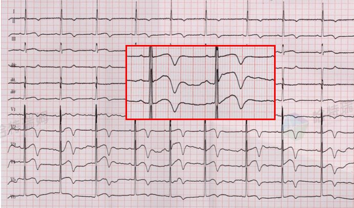 图7 胸前导联(V4~V6)T波倒置如图7,V4~V6导联出现T波倒置,倒置的T波振幅异常升高,呈TV4> TV5> TV3,T波形态双肢略不对称,基底部变窄。