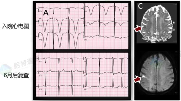 图9 心电图与头颅CT简要病史:73岁女性,主因头晕、头痛、肢体麻木就诊,心电图(图9)可见胸前导联(V1~V4)巨大倒置T波。