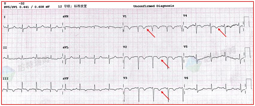 除此以外,V4~V6导联的R波幅度升高,且RV4> RV5> RV3,此为肥厚心肌除极向量增大的结果。