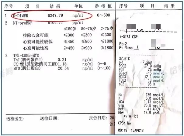 图12 D-Dimer的化验结果急性肺栓塞时T波倒置常出现于V1~V3导联及III导联,形态多呈尖锐对称性,深度不等,倒置幅度Tv2> Tv3> Tv4。