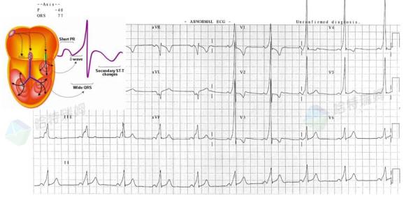 患者各导联QRS波前可见△波,考虑诊断为预激综合征,ST-T为继发性改变;