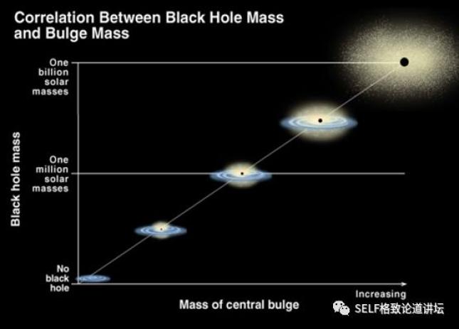 我们可以看到,它们两者呈正相关性,也就是说,黑洞质量越大,它所居住的星系中心的核球质量也会越大。