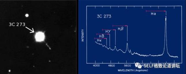 ▲ 第一个活跃黑洞的图像和光谱图左是人类看到的第一个活跃黑洞——3C 273的照片,这是我们在光学波段可以看到的它的样子。它像一个星点,所以我们把它叫作类星体(类似恒星的天体)。
