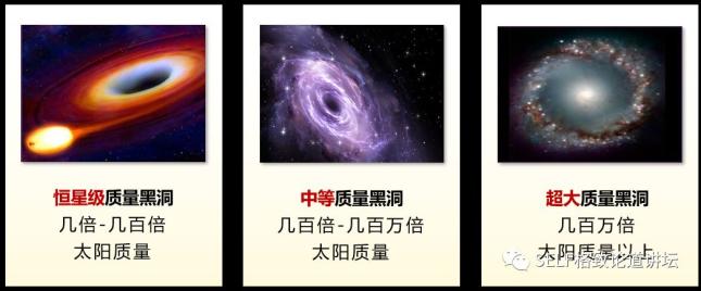 ▲ 三类黑洞根据质量,宇宙中的黑洞分为三类:恒星级质量黑洞,超大质量黑洞,还有介于两者之间的中等质量黑洞。