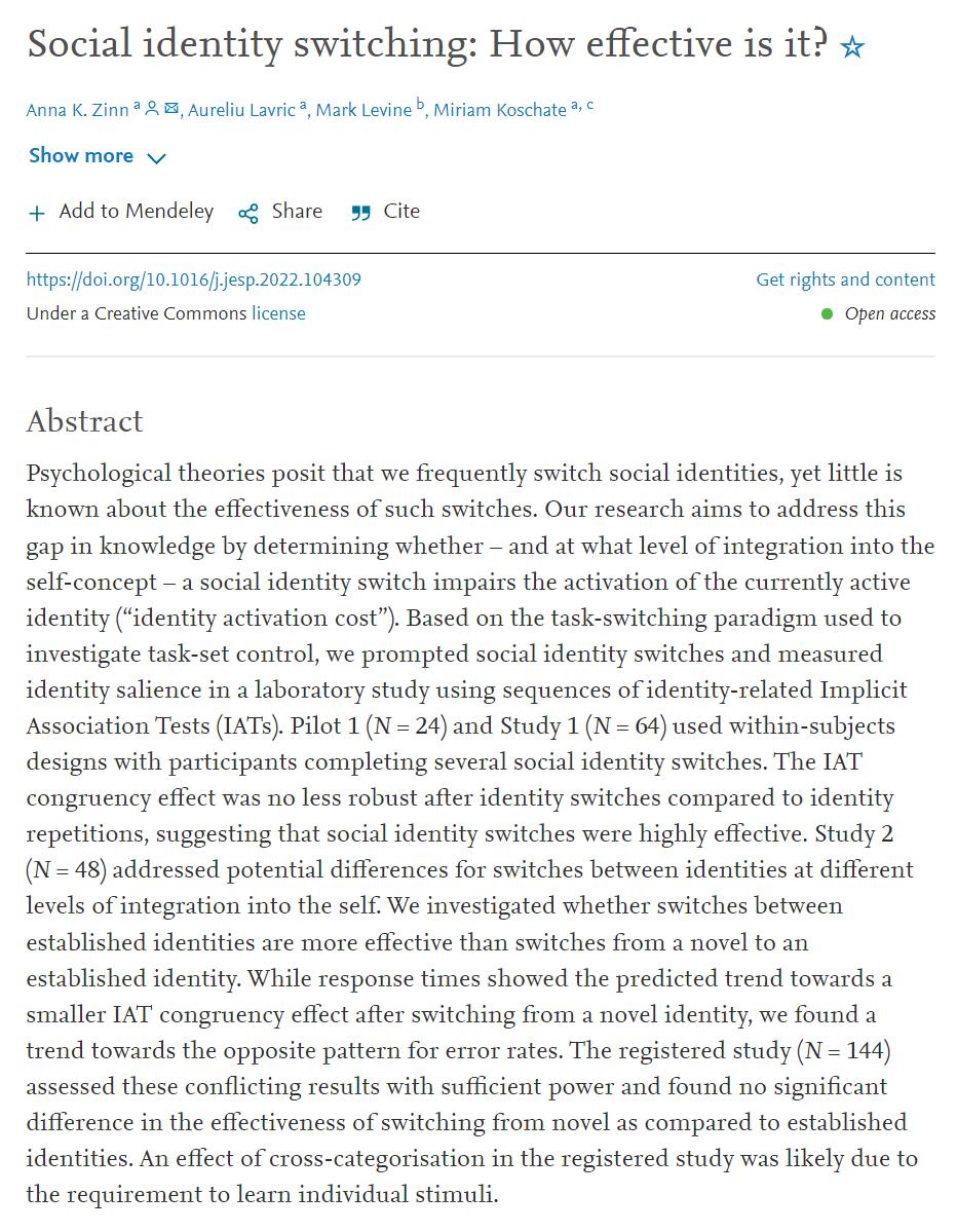 文献:Zinn, Anna K., et al. "Social identity switching: How effective is it?." Journal of Experimental Social Psychology 101 (2022): 104309.DOI:https://doi.org/10.1016/j.jesp.2022.104309