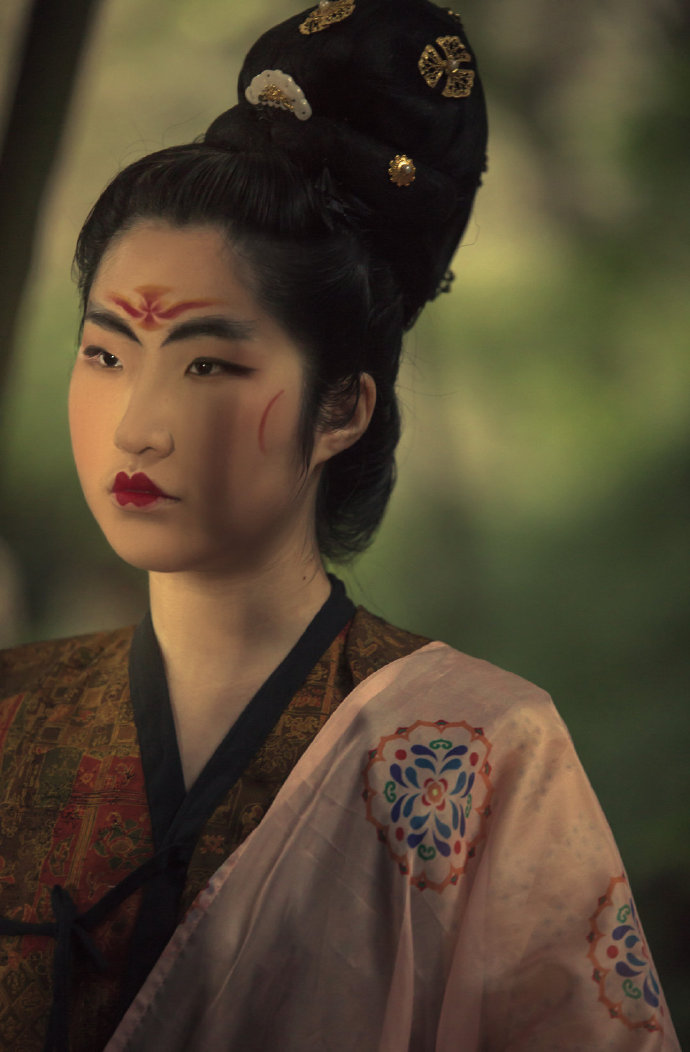 我是一名女性。而我觉得在整个历史洪流中,唐是一个女性非常自信的时代。尤其是武则天执政时期的女性妆面,当时的花钿、斜红,是最复杂最夸张的,有些人可能觉得这些妆容很奇怪,但我曾按照大概的比例复原到模特脸上,比如占据额头三分之一的花钿和飞入鬓的连眉,视觉张力很强,它能流露出足够的自信,也就是女性的一种力量:我认为那是一种“完全不用去在意我这样装扮,这样在脸上有大面积的涂抹会不会不好看”的状态,不去迎合、讨好。所以我就非常爱那个时期。