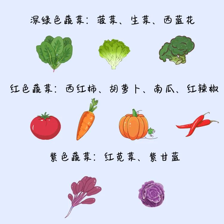 餐餐有蔬菜,保证每天摄入不少于300g的新鲜蔬菜,深色蔬菜应占1/2。深色蔬菜指深绿色、红色、橘红色和紫红色蔬菜。