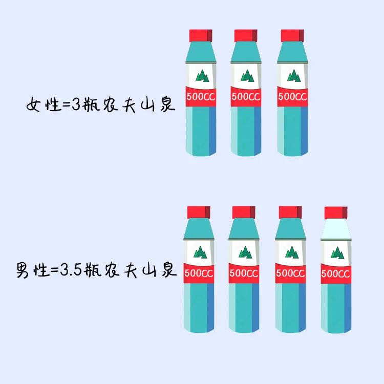 足量饮水,少量多次。在温和气候条件下,低身体活动水平成年男性每天喝水1700ml,成年女性每天喝水1500ml。