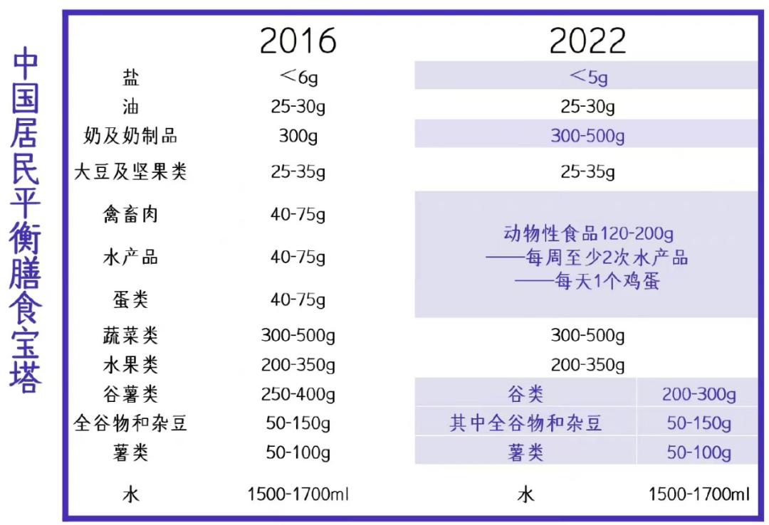 中国居民膳食宝塔(2022)较中国居民膳食宝塔(2016),在推荐摄入量有以下几个变化: