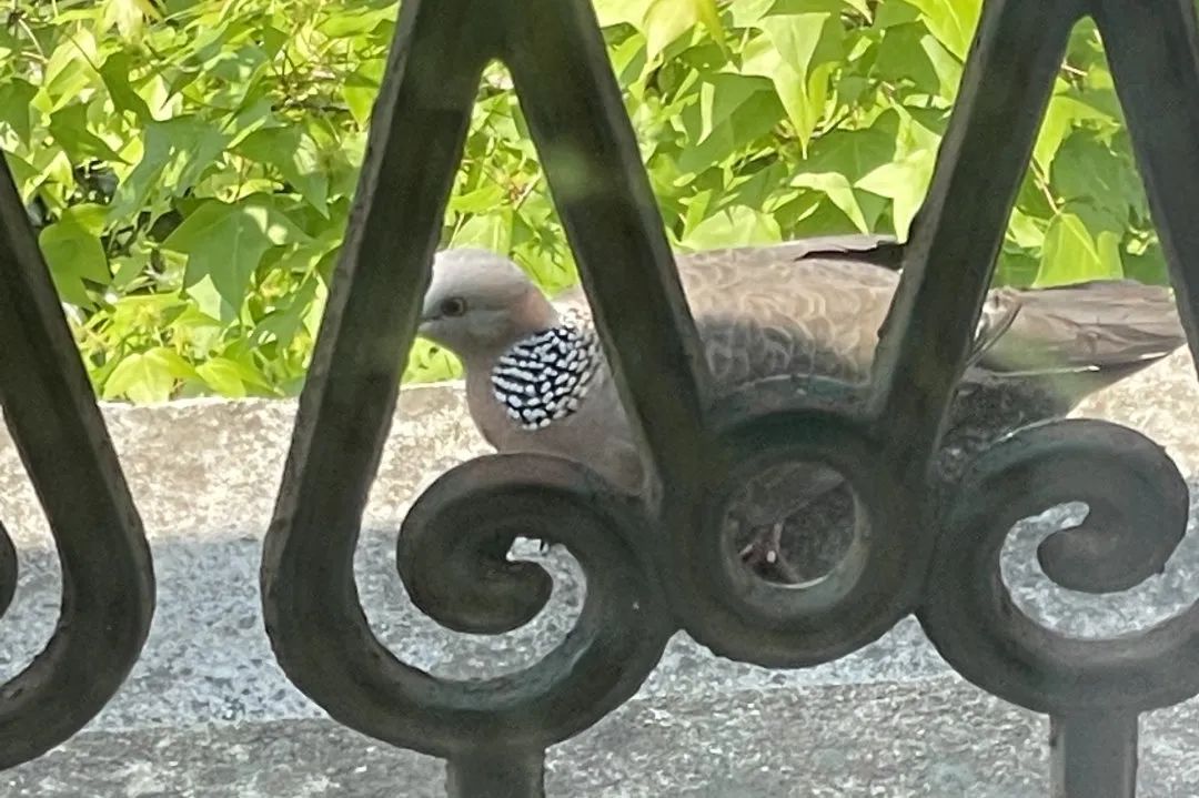 2022年1月14日,它又飞来阳台晒太阳,还带来了另一只斑鸠。我轻轻推开窗户看着它们,试着弹舌头几声,招呼它们安心吃东西。后来西安疫情解除,春天来临。3月29日早上出门,在楼旁的玉兰树上,偶遇正在鸣叫的珠颈斑鸠,离我头顶不到一尺的距离。我举起手机拍到了它鸣叫的样子,它一点儿没有惊慌失措的样子,是不是就是曾在疫情期间,来我阳台晒太阳觅食的那只斑鸠呢?我猜想就是呢,你觉得呢?