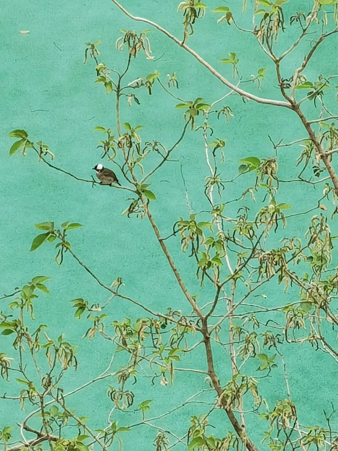 上海封控中,不能下楼,每天趴在阳台看树顶的鸟,听它们开心的歌唱。4月19日听到树顶的鸟歌唱,自己对着它吹口哨。给它拍了照片,很久它才离去。