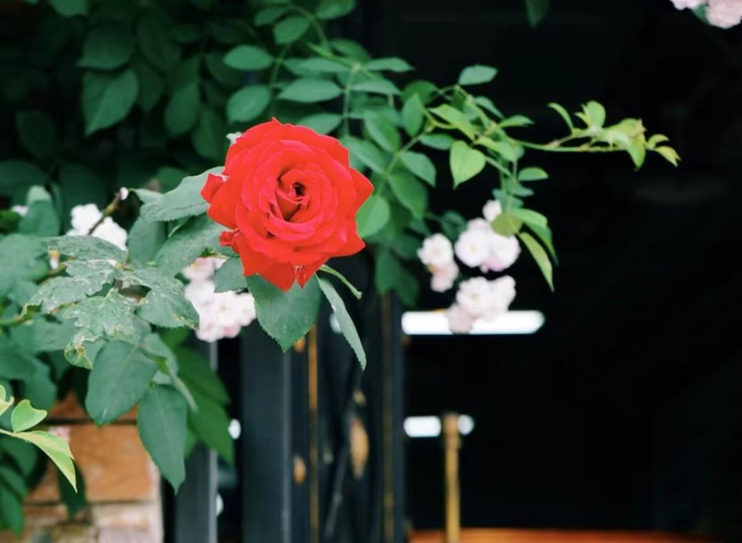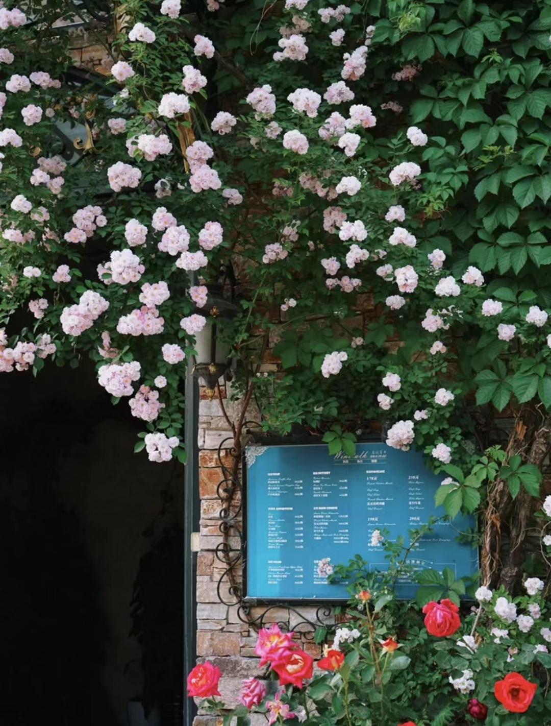 因为是开在西餐厅门口,有复古的砖墙被藤蔓植物覆盖,黑色大门掩映在繁花之下,显得古老又庄重。
