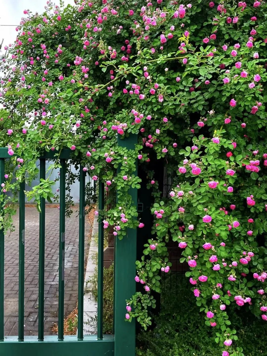 一朵朵、一簇簇攀爬到高处,顺着枝干,顺着绿色的栏栅兀自开放,如同瀑布一般密密层层。