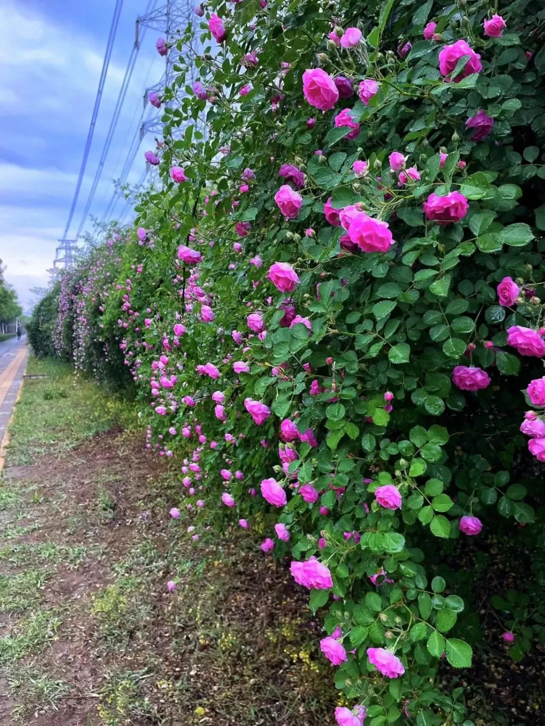 这条路的蔷薇胜在数量多,一整面墙都挂满了蔷薇花,足足有数百余米。