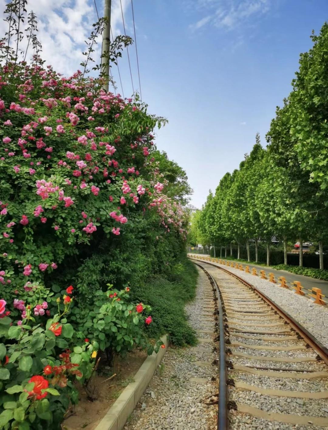 庆丰公园一条僻静的铁路旁,有一堵长达百余米的蔷薇花墙,有着大大小小粉色和白色的蔷薇花朵。这段铁路鲜少有车经过,可以对着花墙摆出各种姿势。