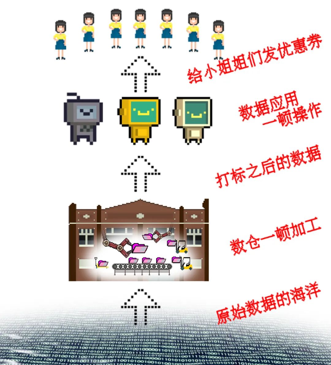 上面的描述有点抽象,数仓到底是怎么运作呢?咱们可以想象这样一个画面: