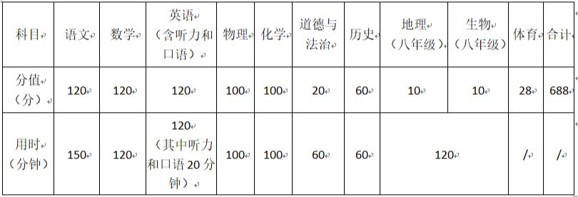 (注:中考总分为700分。英语学科总分为120分,笔试90分,口语、听力测试30分。道德与法治、历史合卷各50分,满分为100分。体育考试满分为40分。)