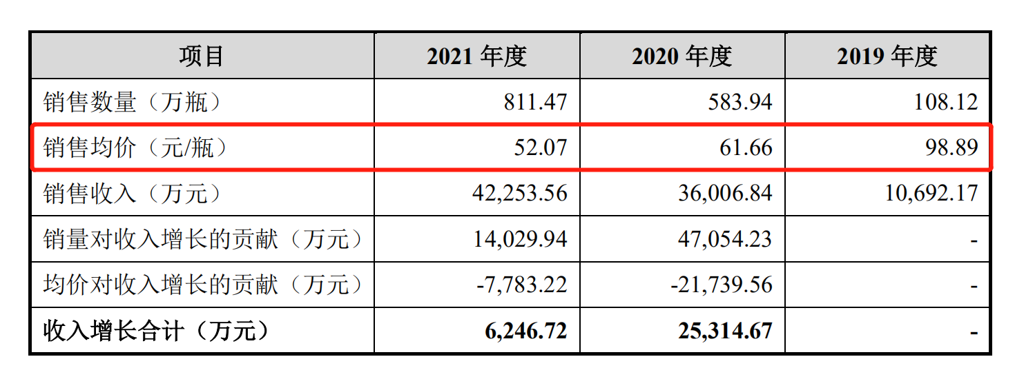 2019年至2021年,燕之屋的“鲜炖燕窝”销售均价从98元降至52元,而同期平均销售成本也由51元降至27元,同时销量从2019年的108万瓶增加到2021年的811万瓶。即便如此,“鲜炖燕窝”也在2021年录得营收4.2亿元,而同比增速已从2019年的982%急速下降至17%。