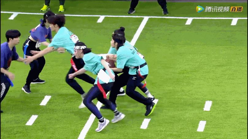 《创造营2021》选手米卡躲过了对手“拔腰旗”的进攻。/《超新星运动会》攻防双方各自的战略通常在比赛之前就由教练或者QB(四分卫)制定妥当,队伍中的每个人在分配到任务后,都需要认真执行自己的岗位。腰旗爱好者Foliar Yip说,这项运动最特别的地方或者最吸引人的地方,是拔旗的那一下快感和大家配合一起完成一件事情的成就感,无论是进攻还是防守,都是在共同完成一件事情,参与度很高。